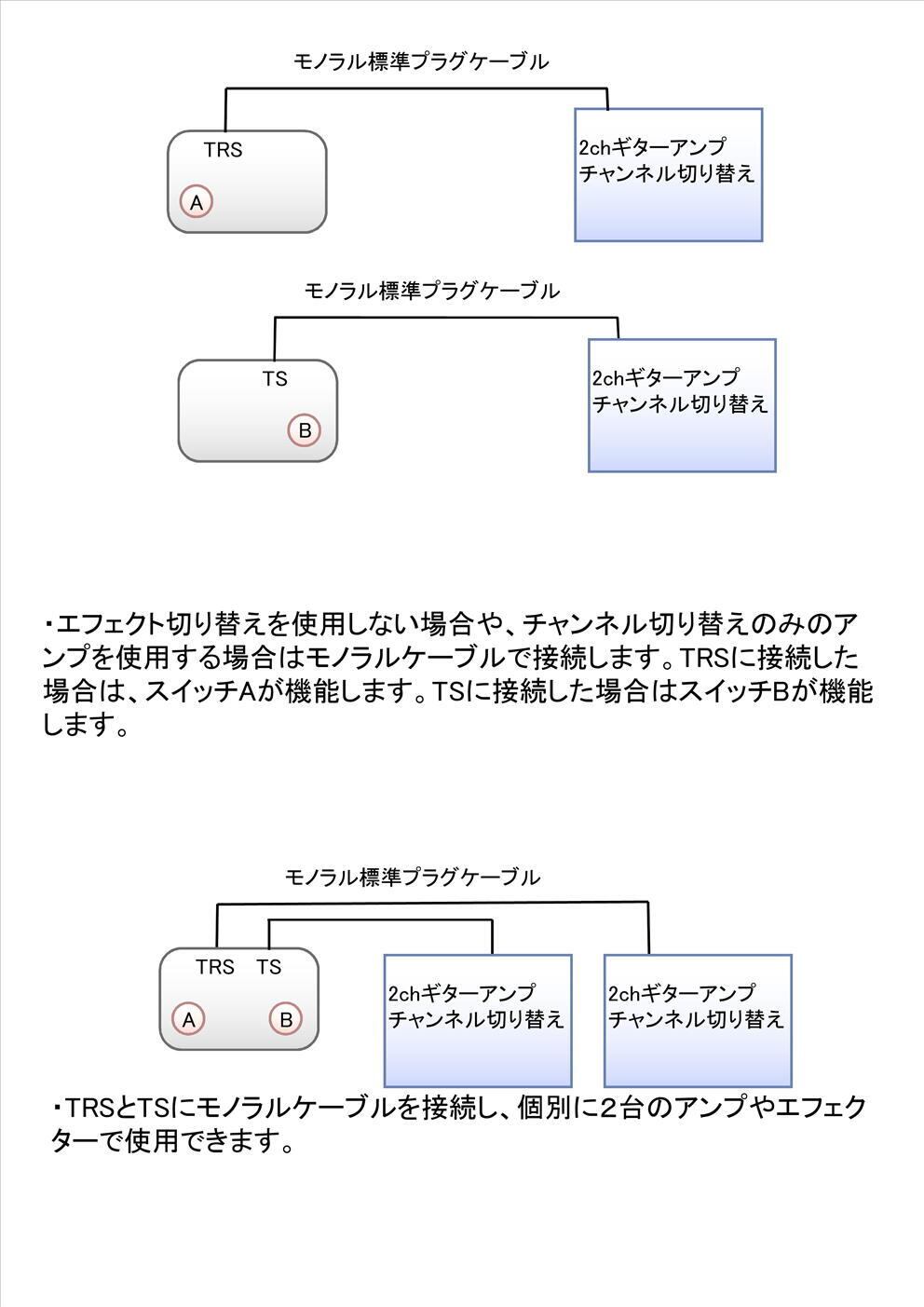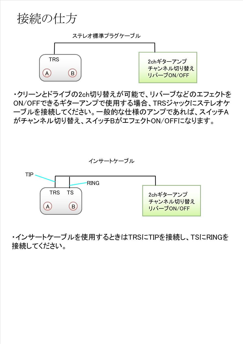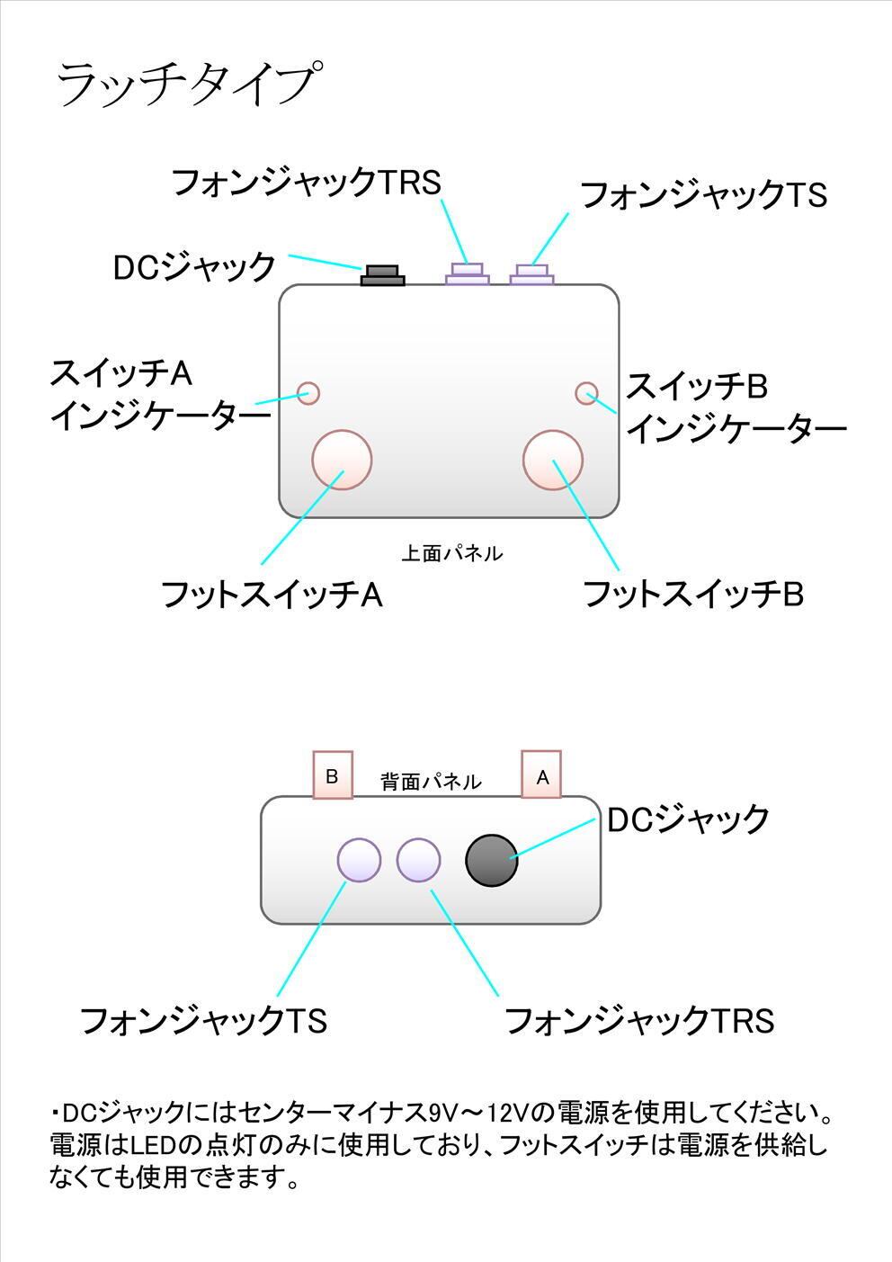 フットスイッチは2つ、ジャックはTRSとTSの2つがあります。電源はDCジャックによる供給のみで、電池は使えません。