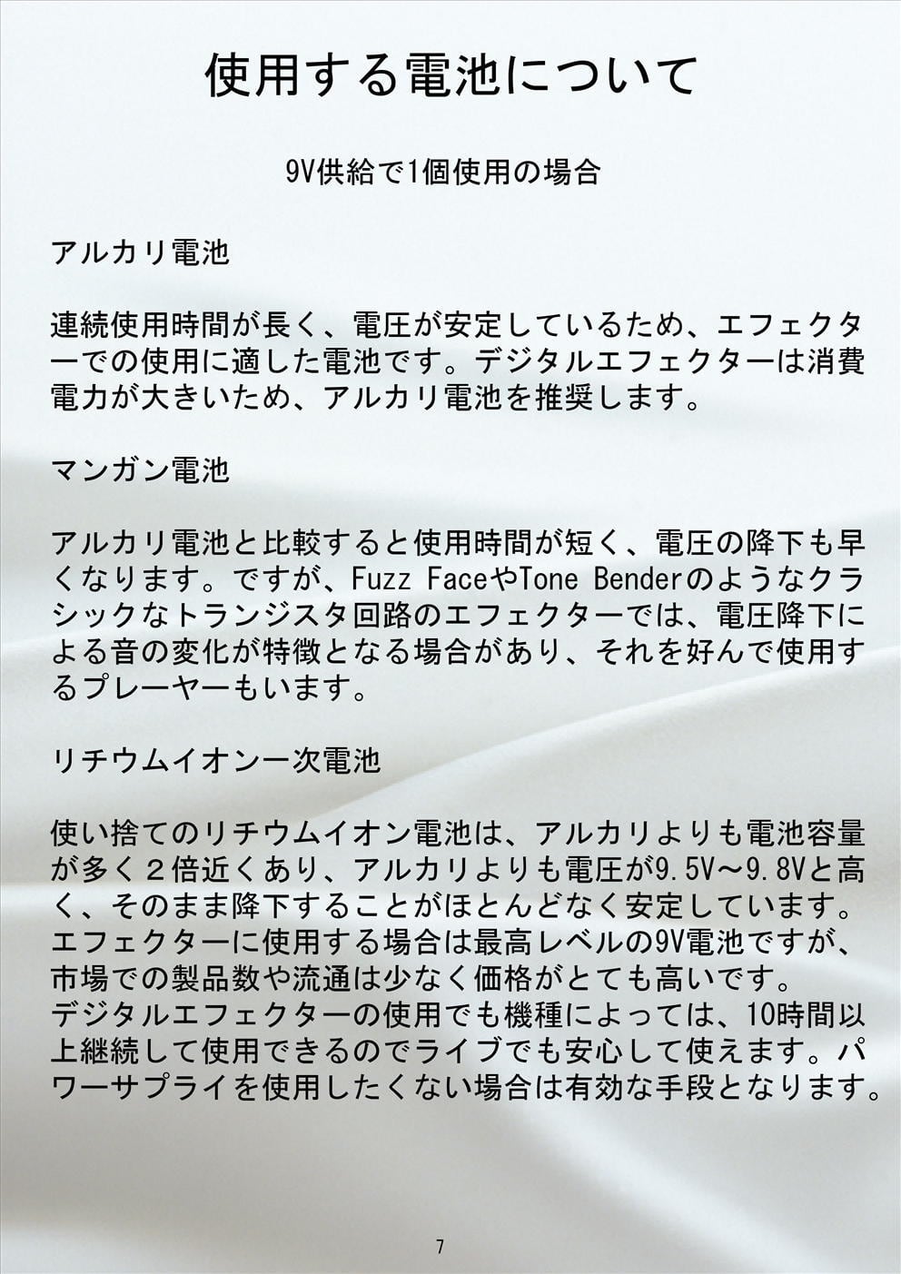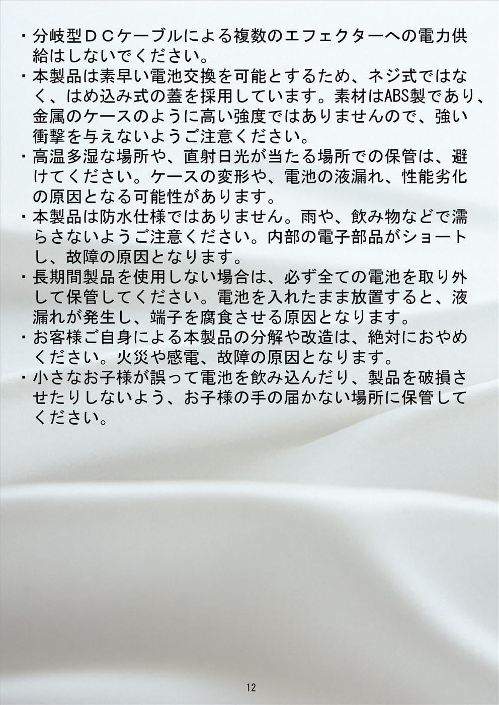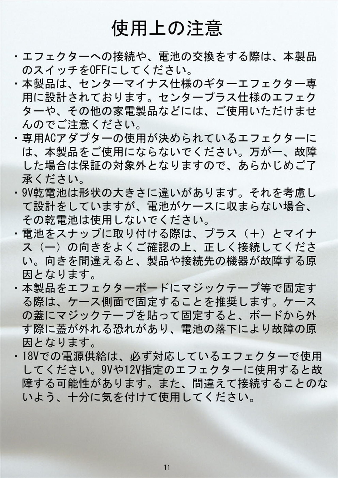 9V電池を正しく使用しないと、エフェクターが故障したり、動作に異常が出る可能性があります。また、間違えて18Vの電源供給を9Vや12V指定のエフェクターに接続しないように十分に気を付けて使用してください。