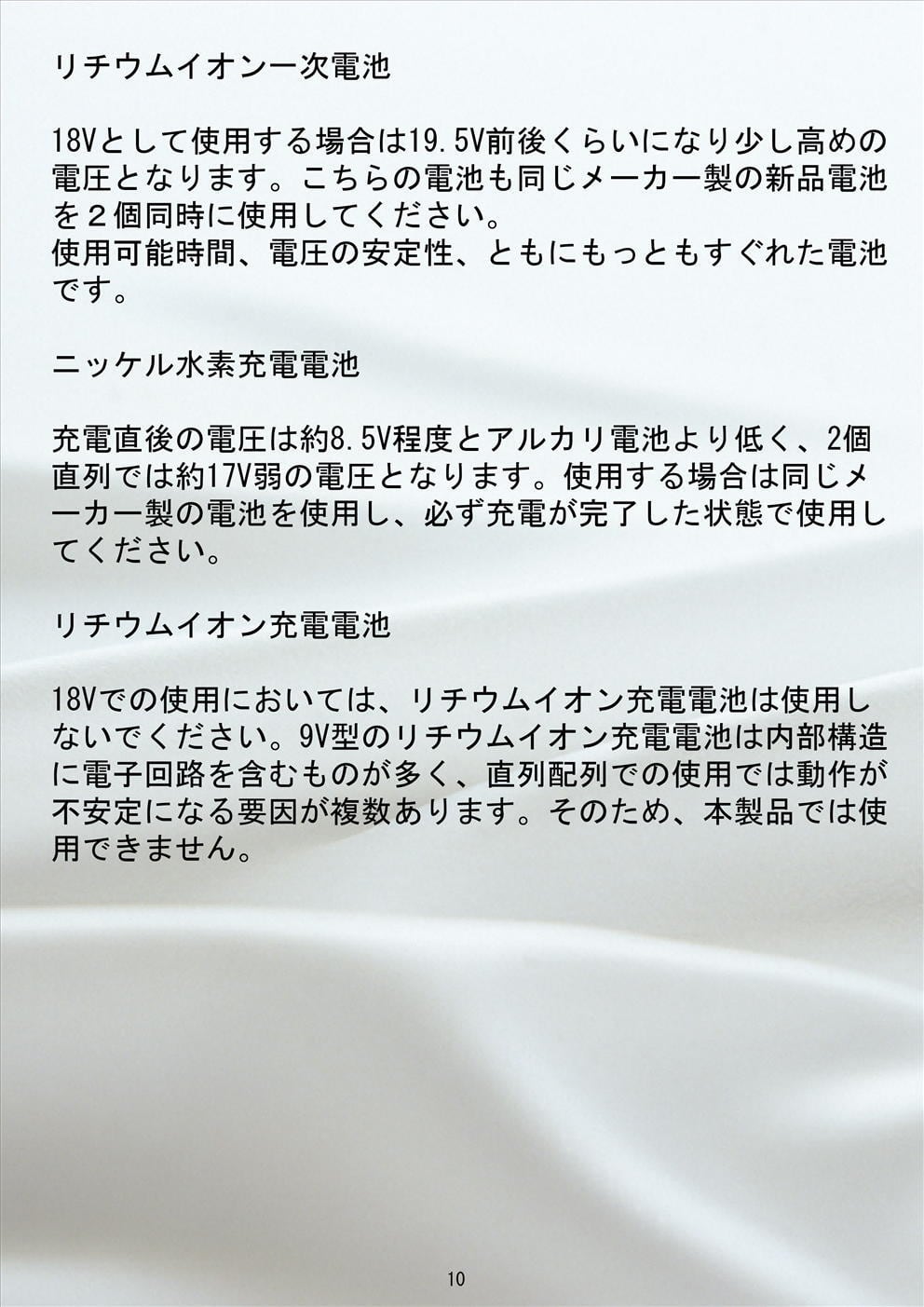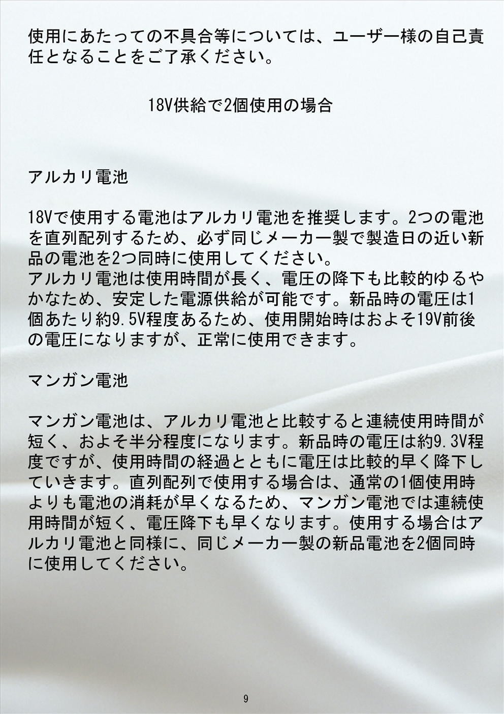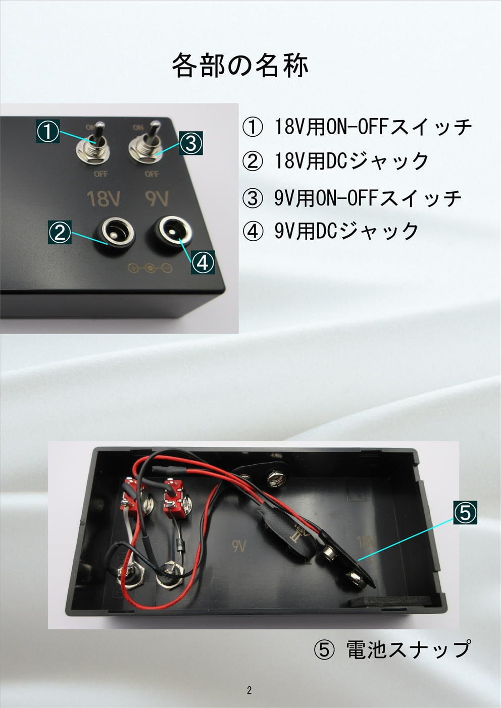 9V電池を正しく使用しないと、エフェクターが故障したり、動作に異常が出る可能性があります。また、間違えて18Vの電源供給を9Vや12V指定のエフェクターに接続しないように十分に気を付けて使用してください。